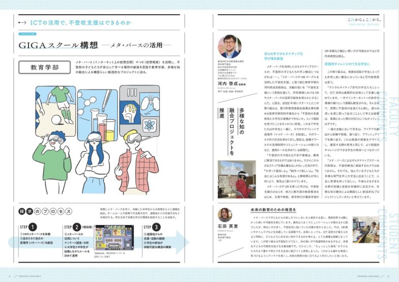 「メタ・バースやVRゴーグルを活用した不登校支援」に取り組むプロジェクトは、教員が自身の研究を活かしながら関わっており、その言葉からは、多様な子どもたちの可能性を広げるようとする希望が感じられます。