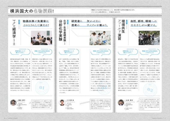 その一つが、学生の間で評判の授業を紹介する「横浜国大の名物授業!」のコーナーです。ただ授業の内容を羅列するのではなく、授業が実社会にどのように活かされるのかが平易な言葉で語られているため、専門外の人にもわかりやすく、一般にも「おもしろそう」と思わせてくれます。たとえば「マクロ経済学」が物価水準や失業率など、私たちの生活に直結する経済活動を分析したり、人口増加や技術進歩がどう経済に影響するかを学んだりする学問であるという内容は、勉強のその先にあるものが明確に見え、学習意欲をそそられます。特に、これから大学をめざす読者にとっては、より身近に感じられる内容なのではないでしょうか。