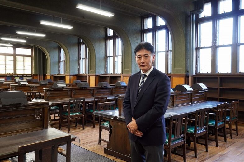 開館当時の机が並ぶ閲覧室。大正初期の揺れガラスは、厚みが均一ではないため、外の景色がゆらゆらと揺れているように見えて不思議な感覚です