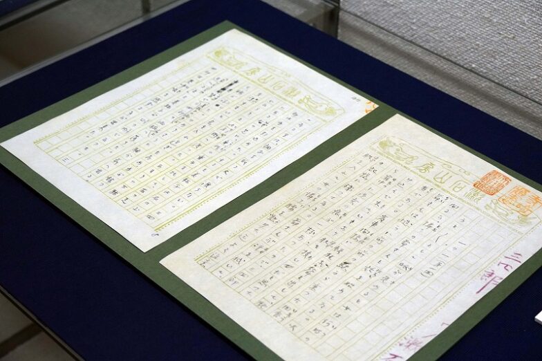 『三四郎』夏目漱石自筆原稿。上部に「漱石山房」とデザインされている特製の原稿用紙で、執筆当時に勤めていた朝日新聞の文字組みが19字だったため、1行が19字になっています