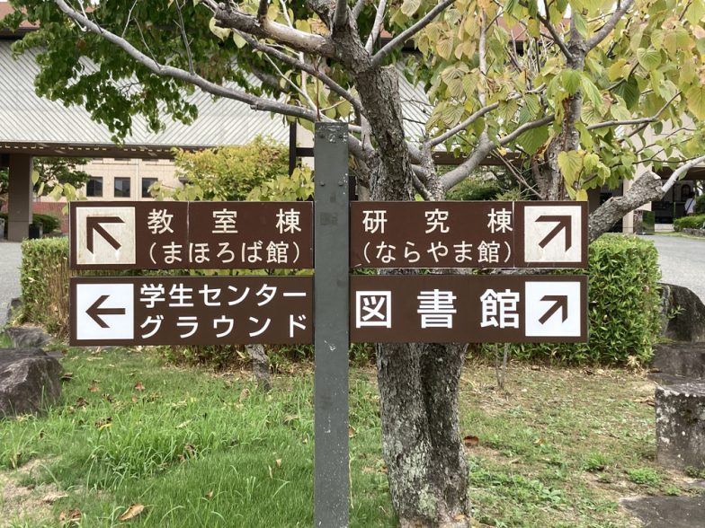 中庭の手前の案内板。研究棟(ならやま館)の方へ