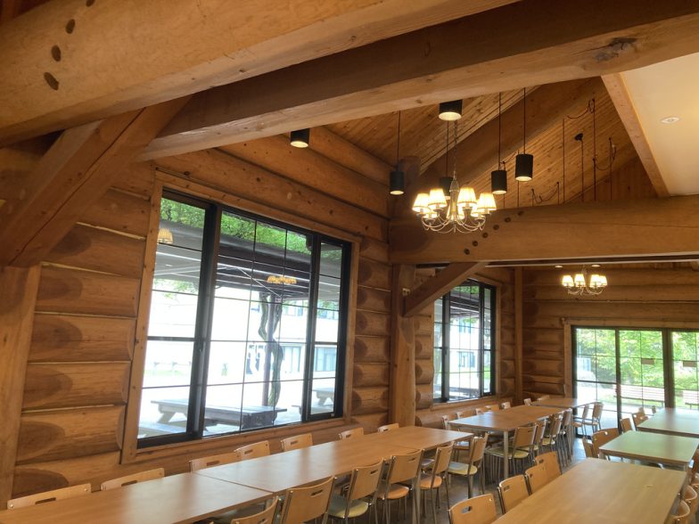 テラス席を備えた二階建てのログハウスで、周囲の自然に溶け込むデザインが素敵です。