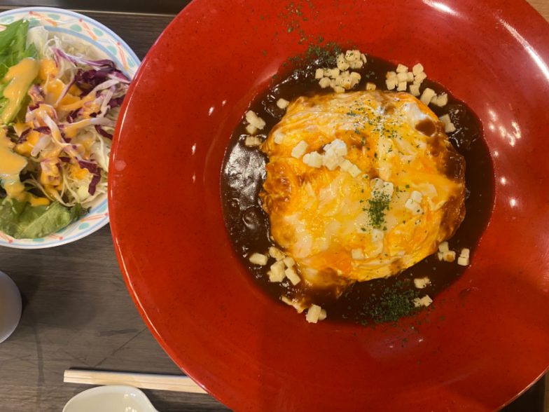 もう一品、「近の鶏卵ふわとろオムライス(\750)」も注文。「近の鶏卵」は近畿大学薬学部の先生が開発に協力し、低コレステロールを実現した卵だそうです。この卵を使ったオムライスは、半熟のとろりとした卵の食感と程よい濃さのデミグラスソースが絶品です。デミグラスソースには角切チーズがトッピングされ、味も食感もよいアクセントに。実は食べる前に「チーズはコレステロール値が高いのでは? せっかくの低コレステロールの卵なのに、台無しにならないのかな…」と思っていたのですが、後から調べたところチーズのコレステロール値はそれほど高くないそうです。よくないですね、思い込みって…。