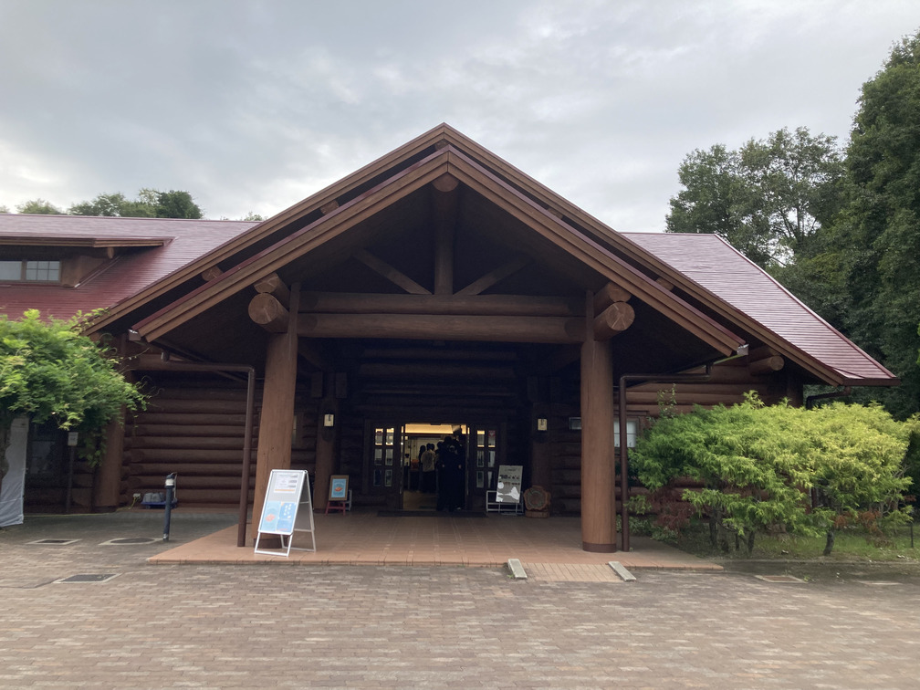 テラス席を備えた二階建てのログハウスで、周囲の自然に溶け込むデザインが素敵です。