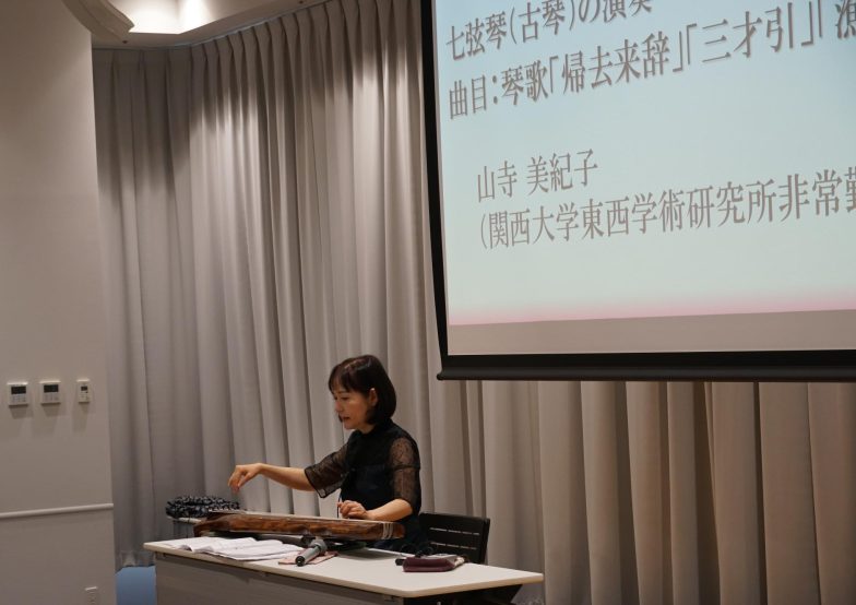 泊園書院では文芸にも親しみ、東畡らも琴を嗜んでいたことから、シンポジウムでは中国由来の七弦琴(しちげんきん)という古琴の生演奏も行われました。演奏は関西大学東西学術研究所非常勤研究員の山寺美紀子先生です。古琴の演奏家であり研究員でもある山寺先生は、文献に基づいて当時の演奏法を導き出したといいます。