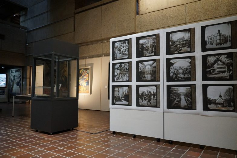 1900年パリ万博のパビリオンを写したガラススライド(展示用に拡大出力されたもの)。スイス館(山小屋)、化学工業製品館、電気館、農業館などが写っている