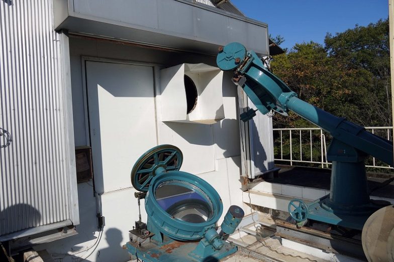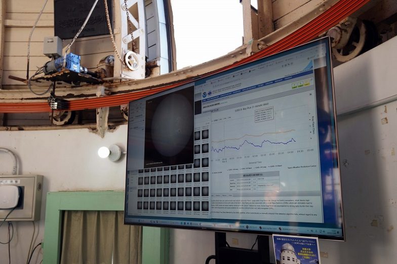 年季の入った18cm屈折望遠鏡ですが、今も現役で、毎秒1枚の間隔で太陽表面の撮影画像を取得し続けています。「太陽表面で起こる爆発が研究対象です。爆発で地球に到達する電磁波放射や高エネルギー粒子は電波障害やGPS障害を引き起こしますから、こうした障害を予測できるようにしたいと研究しています」とスタッフさん。太陽の撮影は今でこそデジタルですが、昔はフィルムカメラが使われていたため、ドームには隠し部屋のような小さな暗室もあります。まさに科学と歴史の面白さが一度に味わえる興味深い場所なのです。