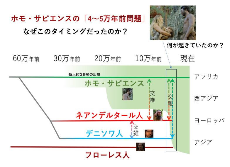 ネアンデルタール人とホモ・サピエンスが出会い、交雑が行われた時期は今から4〜5万年前だと言われています。では、なぜその時期に両者が交わり、その後、ホモ・サピエンスだけになったのでしょうか? そのタイミングで何が起きていたのでしょうか?