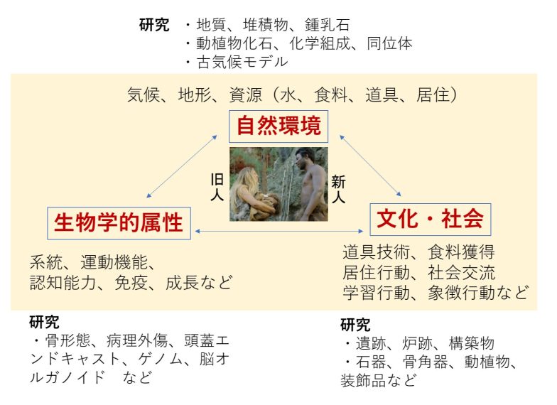 その謎を解くため、現在は次の3つ研究手法が用いられているといいます。まず1つ目は、生物学的属性に関する研究。骨の形態、脳の構造から運動機能、認知能力などを推測します。2つ目は自然環境に関する研究。堆積物、動植物の化石などから気候、地形、資源などを推測します。
