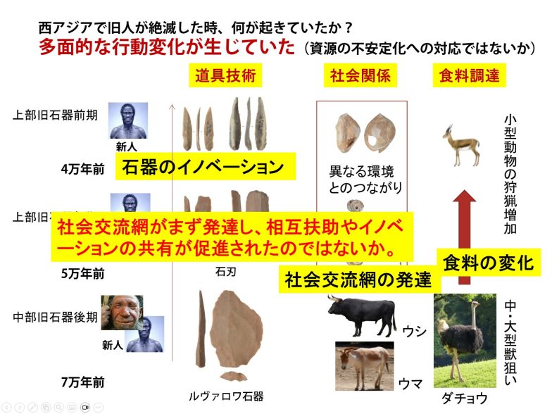 気候や環境の変化が与えた影響は大きく、乾燥が進んだ土地では暮らしづらくなったため、4.7万年前後には新人はヨーロッパに進出。ブルガリア、ドイツ、イギリス、イタリアでも新人の拡散に伴った石器文化が発見されているそうです。その後、時間をかけて新人が拡散・増加していくわけですが、旧人がその路線から外れたのは、社会交流が活発になることで集団間の競争が生じたからではないかと門脇先生は考えます。