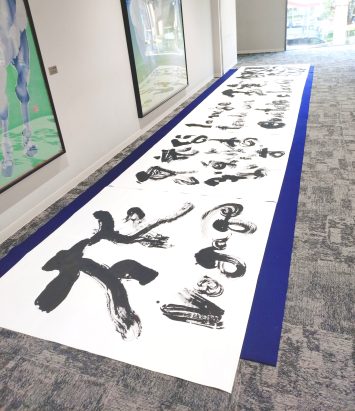 書き上げられた書は一枚一枚、学生たちの手でひろげられて会場にしめされます。下は、「旅」から生まれた書。