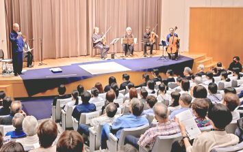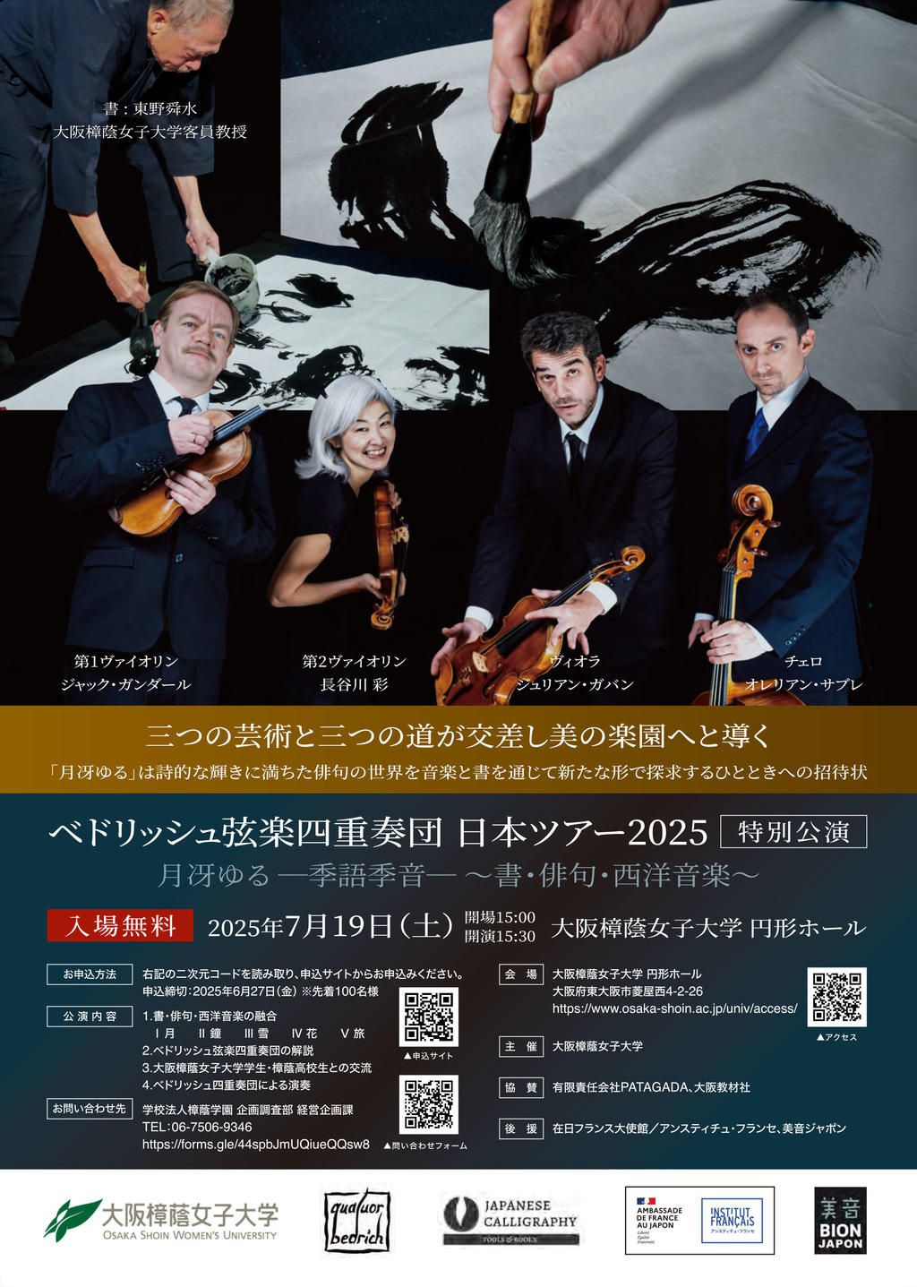 「月冴ゆる -季語季音- 〜書・俳句・西洋音楽〜」と銘打たれた本公演は、フランスを拠点に活動する「ベドリッシュ弦楽四重奏団」による日本ツアーのひとつ。大阪・東京とめぐる公演のなかで、大学での開催はこの一回のみ。今回、ベドリッシュとコラボレーションする書道家で同大学客員教授の東野舜水(しゅんすい)先生のご縁で実現したそう。