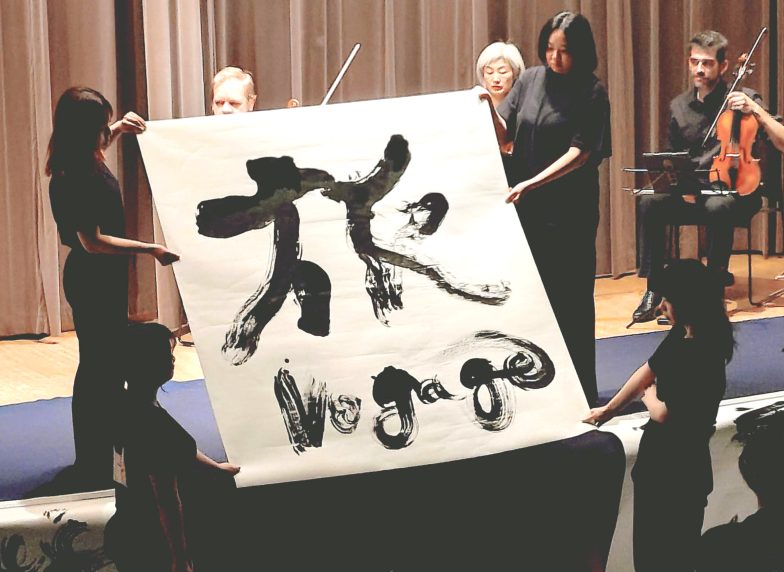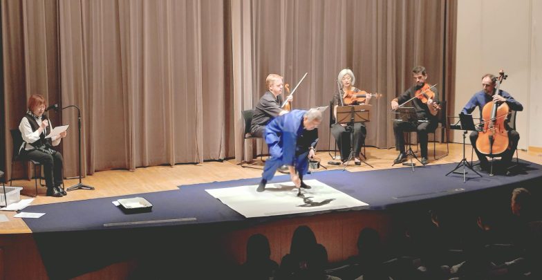 短い言葉に込められた孤独と、どこか解放への感覚がホールに静かに広がります。その声に導かれるように、東野先生が舞台正面で大筆を振るって書を力強くしたためていき、場が文字によって結ばれはじめたところで、弦楽四重奏の音色が重なりあいます。