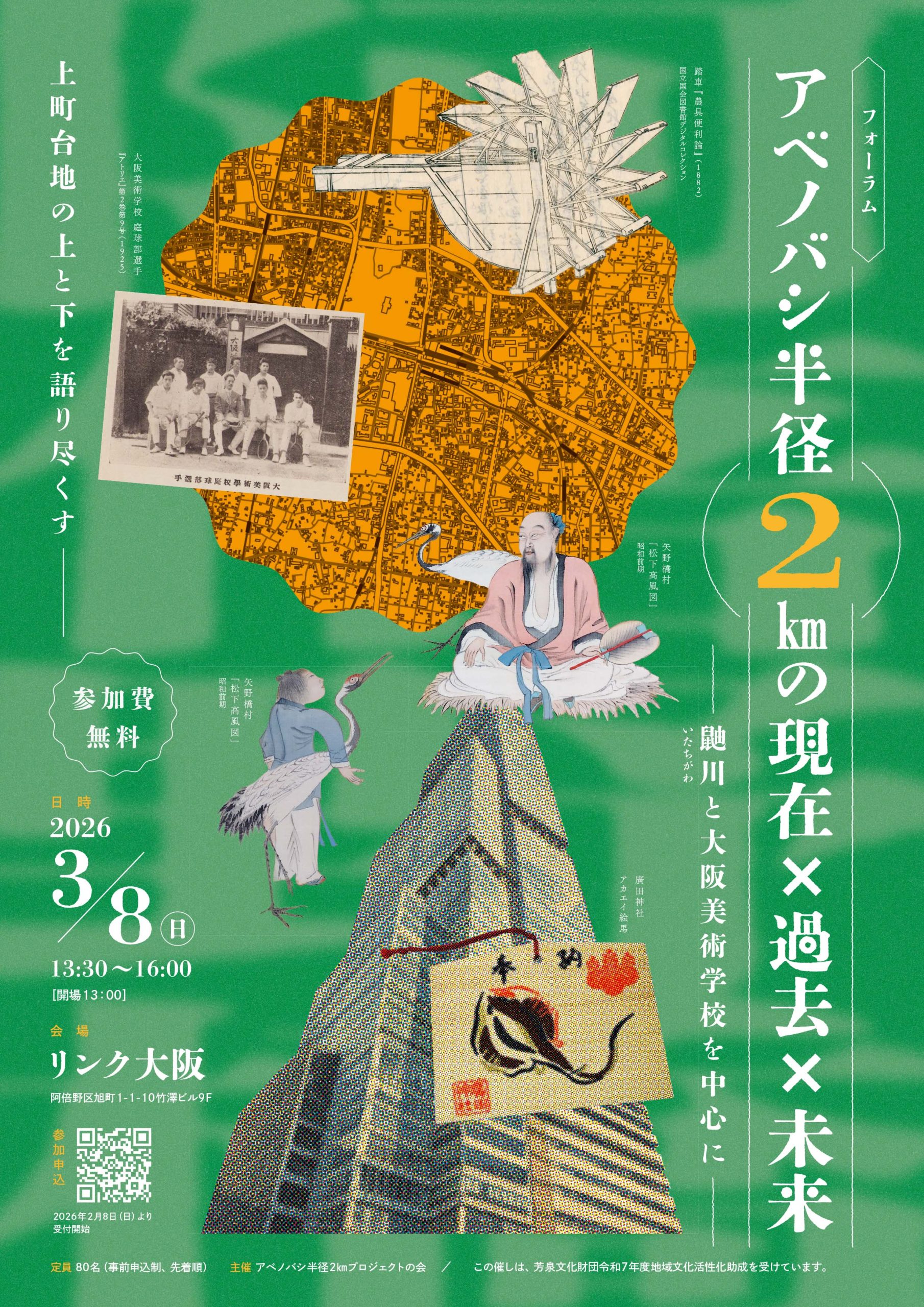 大阪・阿倍野橋から半径2kmの範囲内を、文化や歴史の側面から掘り下げる「アベノバシ半径2kmプロジェクト」。大阪大学総合学術博物館の副館長で教授の船越幹央先生をはじめとしたメンバーで、該当エリアの低湿地から台地までを含む起伏に富んだ一帯の地域的な特色を掘り下げています。2025年に開始されたプロジェクトには都市論、民俗学、歴史学、美術史などの専門家が参加。幅広い学問分野を横断し、研究会やフィールドワークなどを行っています。
