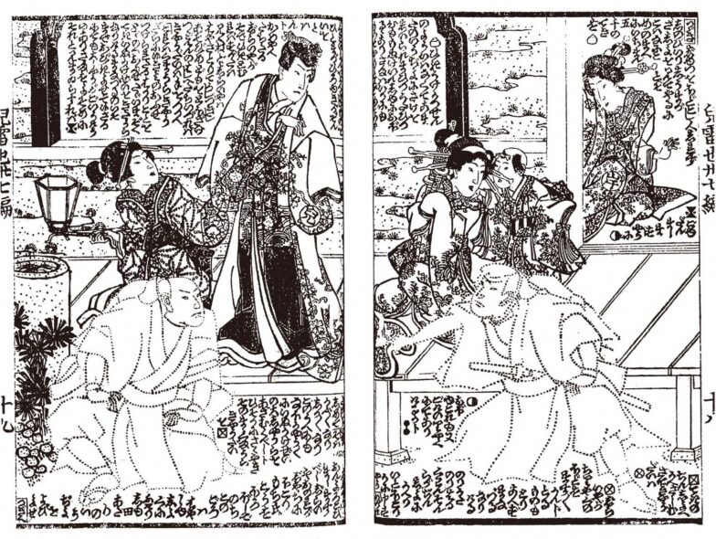 江戸時代末期の作品の例。隠形の術で透明人間になった二人。衣服や刀も含めた輪郭が点線で描かれており、身につけているものごと透明になっています(『児雷也豪傑譚』第37編、1860年、国書刊行会刊影印より)