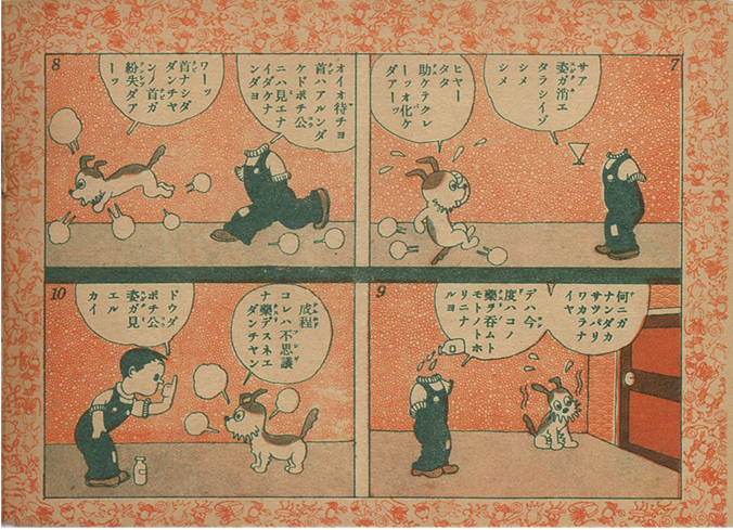 ウェルズの『透明人間』以降の近代作品の例。薬で透明人間になった少年。衣服や持ち物は描かれており、顔や手だけが透明になっています。「透明人間」をタイトルに含んだ、おそらく日本初の漫画本とのこと(赤本マンガ『透明人間』より、1938年、中村書店)